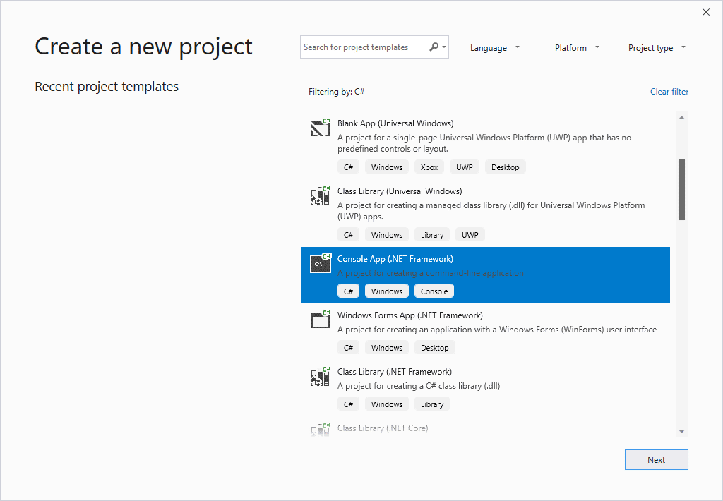 There is another template for Console Apps. The second one is specific to Windows. You can use that one, if you prefer. The screenshot below shows it selected: