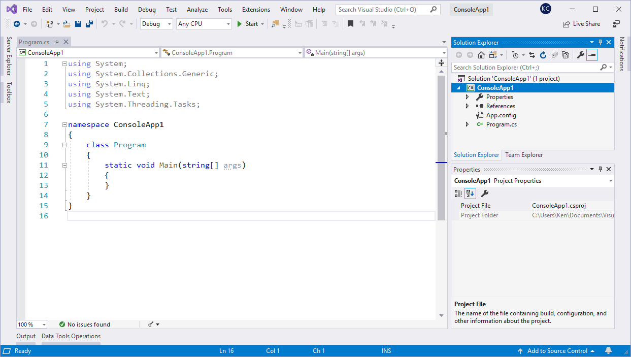 When you click OK, a new Console Application project will be created for you. Some code should be displayed. You can now skip the next section and pick up with the heading All Users.