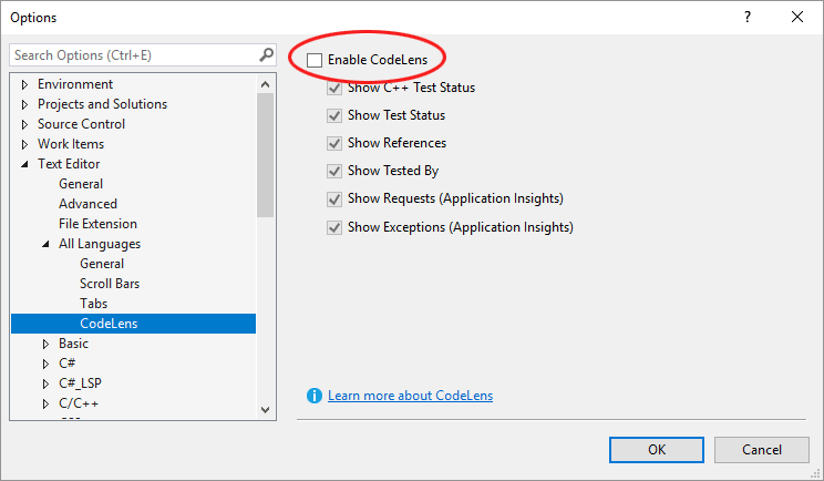 In Visual Studio Community 2019, you may also see lines that say references. These will be grey. It's part of a new addition called CodeLens. If you don't want to see these lines, click Tools on the menu bar at the top. From the Tools menu, click on Options at the bottom. You'll see a dialogue box appear. Expand the Text Editor item, then All Languages. Select CodeLens. Deselect the Enable CodeLens option: