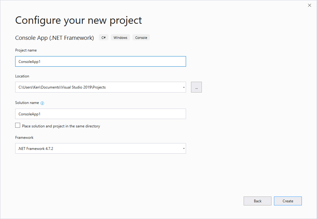 You can choose a location to save your projects. We recommend creating a folder called Visual Studio 2019 to save all your work. Inside of the Visual Studio 2019 folder, create one called Projects. This will model the save location of previous versions of the software. Click the grey button to the right of the location box to do this.