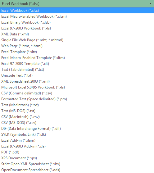 If you click the dropdown list, where it says Excel Workbook (*.xlsx), you will see that you can save your workbook in lots of different formats: