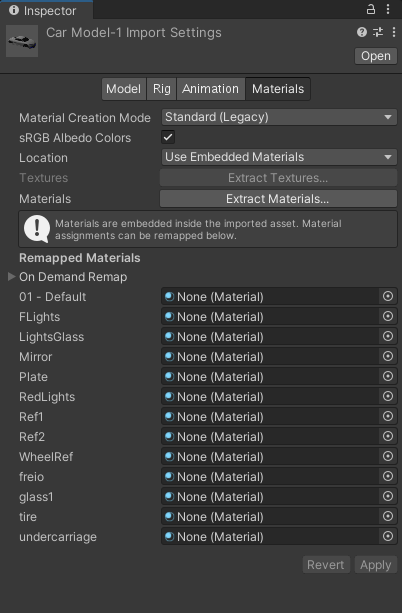 Inside of the Models folder should be three items: folders called Materials and Textures, as well as a model called CarModel-1. Click on the CarModel-1 item to select it. Now have a look at the Inspector on the right. You should see this: