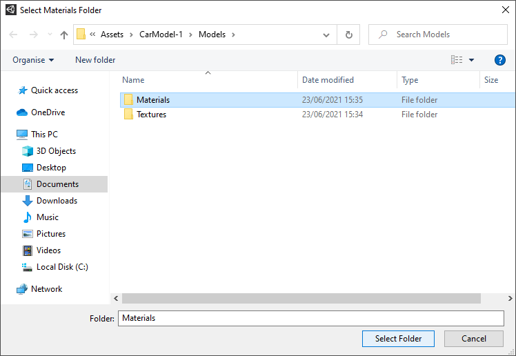 As you can see, all the boxes say None (Material). So, click the button that says Extract Materials. You'll see a file dialog appear. Select the Materials folder and then click the Select Folder button: