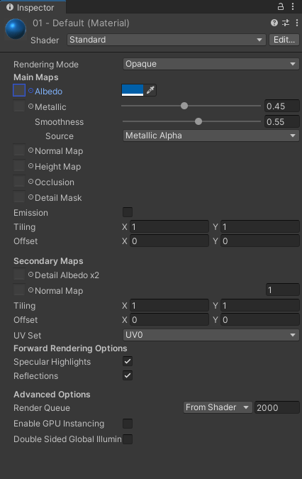 We went for an Hexidecimal value of 005FA8 for the Albedo. This is a blue color. We set the Metallic slider to 0.45, and the Smoothness to 0.55.