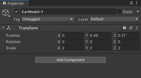 Select CarModel-1 after you've dragged it into the CAR-ROOT parent. In the Inspector on the right, set the Position and Scale values to these: