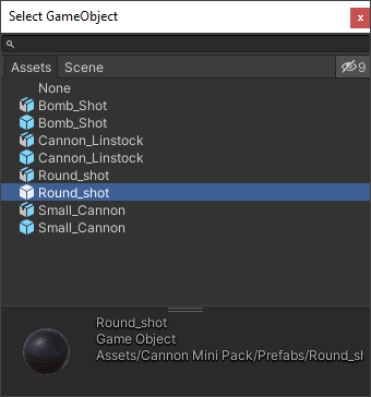 Click the Assets item at the top. From the list, Double-click the second Round_shot item (the first is for the original prefab). Double-clicking will select an item and close the dialog box down.