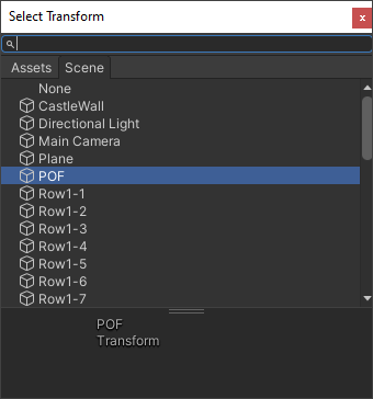 This time, click on Scene at the top. Now double-click the POF item from the list, which is the empty game object the cannonball will be coming from.