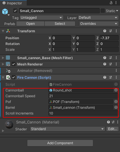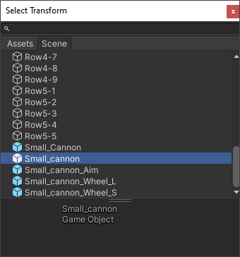 In the Hierarchy, select your parent Small_Cannon item: