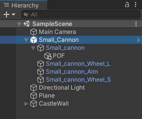 Right-click on Small_cannon. From the menu that appears, select Create Empty. Rename the empty object to POF. (Short for Point of Fire). Your Hierarchy will then look like this: