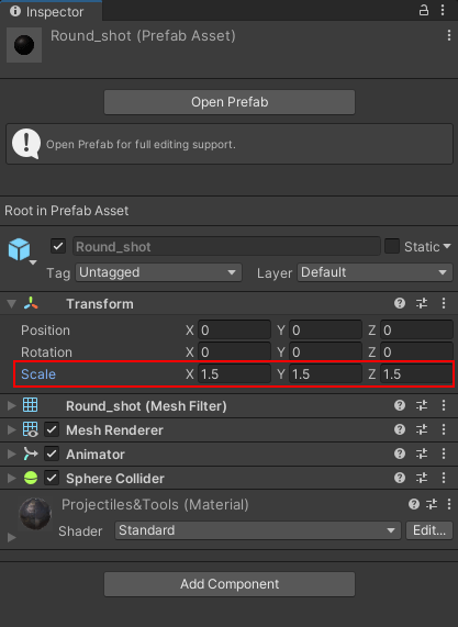 The cannonball is a bit small. So, in the Transform section of the Inspector, change the Scale values to 1.5: