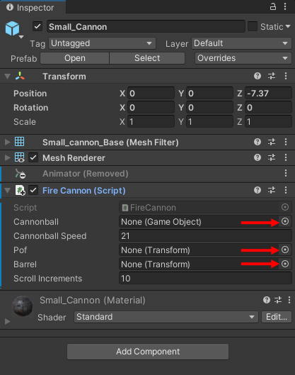 We'll get rid of the Animator attached to the cannon. So, in Hierarchy on the left, select your cannon. In the Inspector on the right, click the three tiny circles to the right of the Animator: