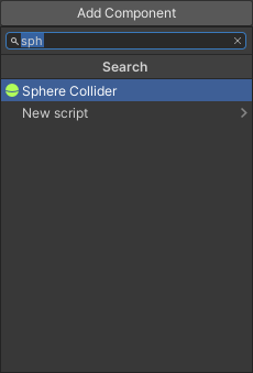 Click on Round_shot to select it. Now, in the Inspector on the right, click the Add Component. Type Sphere Collider in the search box and add one of those: