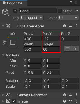 So, set your anchors to top, left. And set the height of the panel to 60. Set the Pos Y value to -17. Your Inspector will then look like this: