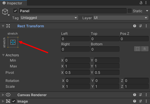 Notice the four white triangles in the corner. These are the anchors. They are in the corner because the default is set to stretch, stretch in the Rect Transform of the Inspector: