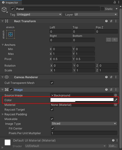 Right-click on your Canvas in the Hierarchy. From the menu, select UI > Panel. By default, a panel will fill the whole of the canvas in a white colour. The Panel is actually an image with a low transparency (the Alpha). In the Inspector, click on the Color item: