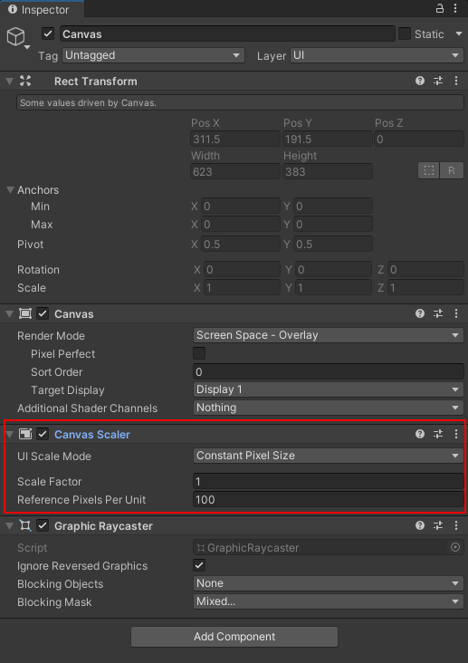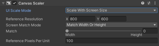 With the Canvas still selected in the Hierarchy, have a look at the Inspector on the right. Notice that there is a Canvas Scalar section: