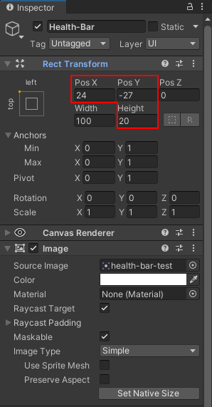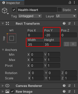 The image is a bit big, though. So, in the Rect Transform area of the Inspector, change the width and height to 35. Also, change the Pos Y value to -20. Here's the Inspector: