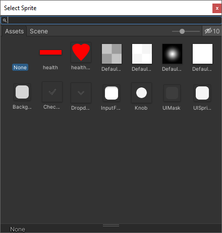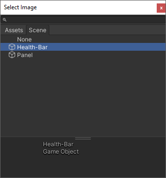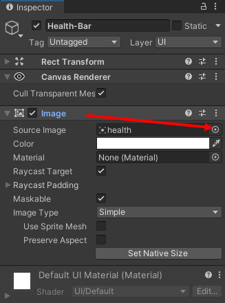 Make sure Health-Bar is selected in the Hierarchy. In the Inspector on the right, click the small circle to the right of Source Image to bring up the dialog box.