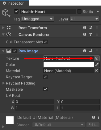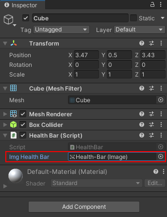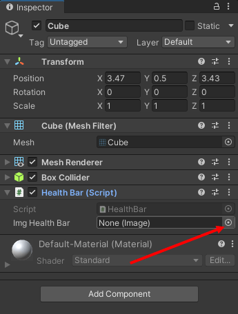 Make sure your Cube is still selected. In the Health Bar script section of the Inspector, click the tiny circle to the right of Img Health Bar, as indicated in the image below: