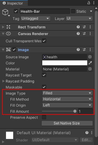Still in the Inspector, and with Health-Bar selected in the Hierarchy, notice that there is an Image Type further down, in the Image section, as well as a Fill Method and Fill Origin. Set the values for these as follows: