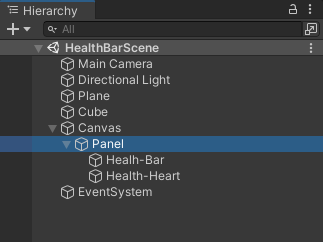 In the Hierarchy on the left, right-click your panel. From the menu that appears, select UI > Image (not Raw Image). Rename to Health-Bar. Your Hierarchy should look like this: