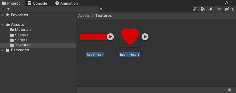 Now select your health-bar image in the Project area. Do the same - change the Texture Type in the Inspector to Sprite (2D and UI). Click Apply and your health-bar should then have the same arrow icon the right as the heart: