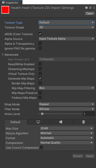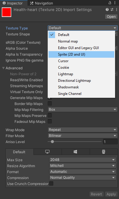 When you select Sprite (2D and UI), the Apply button will become available in the bottom right. Click the Apply button and your health-heart will now look like a heart in the Project area: