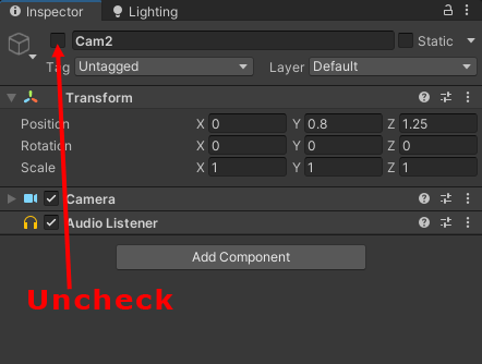 In the Hierarchy, select your Cam2 object. Now uncheck the box at the top in the Inspector: