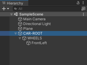 So WHEELS is a Child of CAR-ROOT and FrontLeft is a Child of WHEELS.