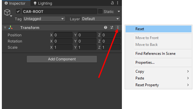 Now add an empty game object (Game Object > Create Empty). Rename this to CAR-ROOT. And reset the Transform values in the Inspector: